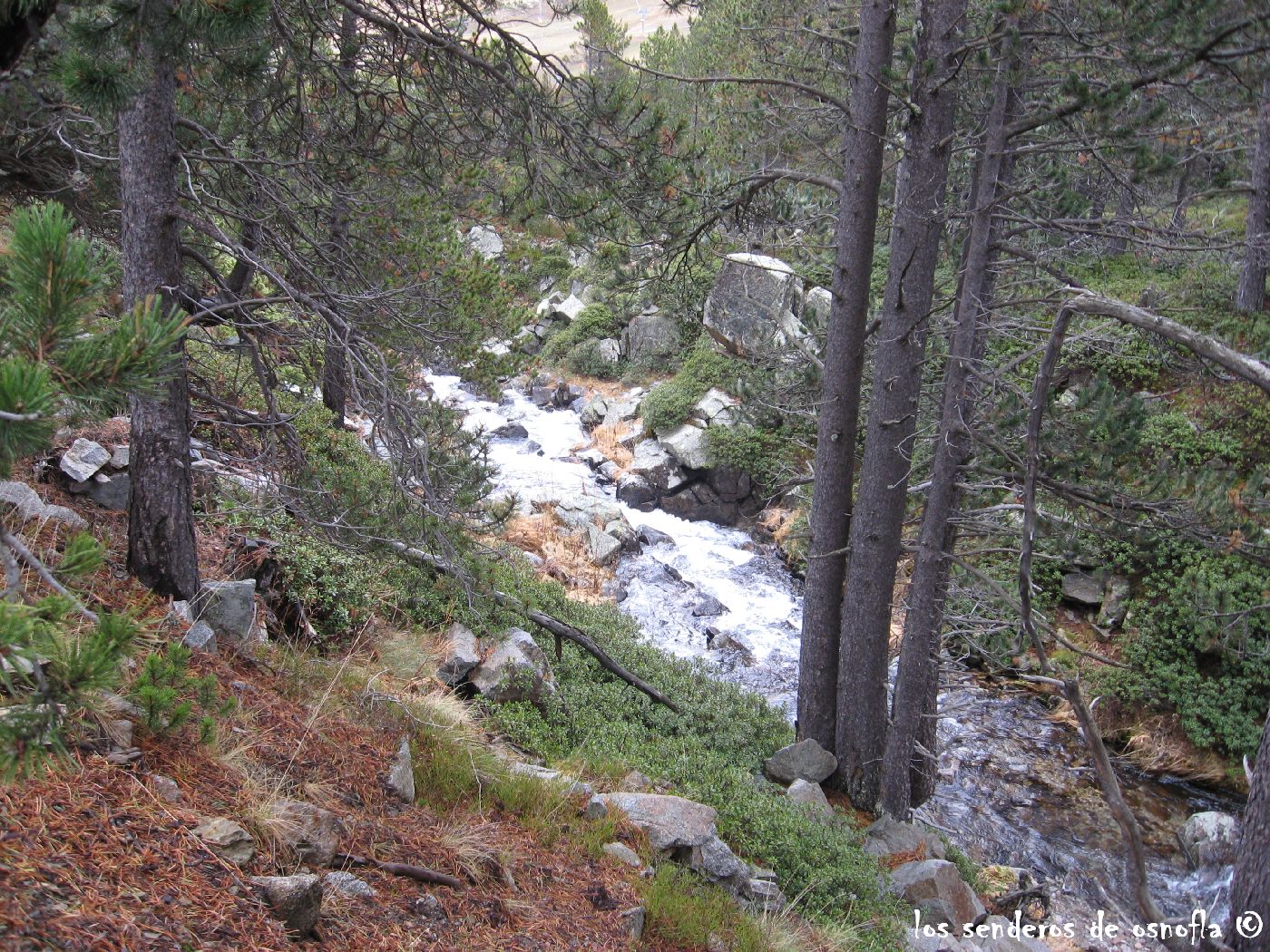 Poco antes de la altura donde el camino se une al torrente, debemos introducirnos entre los pinos, por la derecha, dejando la pista, para continuar por un sendero. Esta marcado en principio con unos hitos de piedras y luego con marcas de pintura azul.